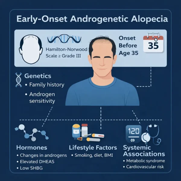 Beyond hair loss itself, early-onset AGA is linked to metabolic and cardiovascular risk factors, suggesting that it may serve as a phenotypic marker of underlying endocrine–metabolic dysregulation. Multifactorial in origin with contributions from genetics, hormones, and lifestyle factors, early-onset AGA warrants both dermatologic and systemic assessment in young men. Integrating scalp evaluation with broader health screening may enable earlier identification of at-risk individuals and facilitate comprehensive care that addresses both aesthetic and health outcomes.