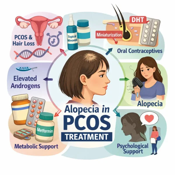 Pathophysiologic Rationale for Treatment: Hair loss in PCOS is primarily androgen mediated. Elevated circulating androgens, reduced sex hormone–binding globulin (SHBG), and increased local conversion of testosterone to dihydrotestosterone (DHT) within the scalp all contribute to follicular miniaturization. Importantly, PCOS illustrates the paradox of androgen action: while androgens promote terminal hair growth in androgen-sensitive body sites (hirsutism), they induce progressive miniaturization of scalp hair follicles.